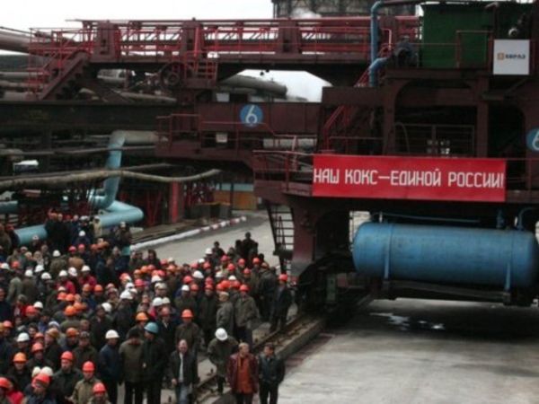 Снимок был сделан в октябре 2003 года в городе Кемерово на заводе ПАО «Кокс». В то время по всей стране проходили предвыборные митинги, и рабочие предприятия вышли поддержать партию власти с плакатом «Наш кокс — Единой России!».