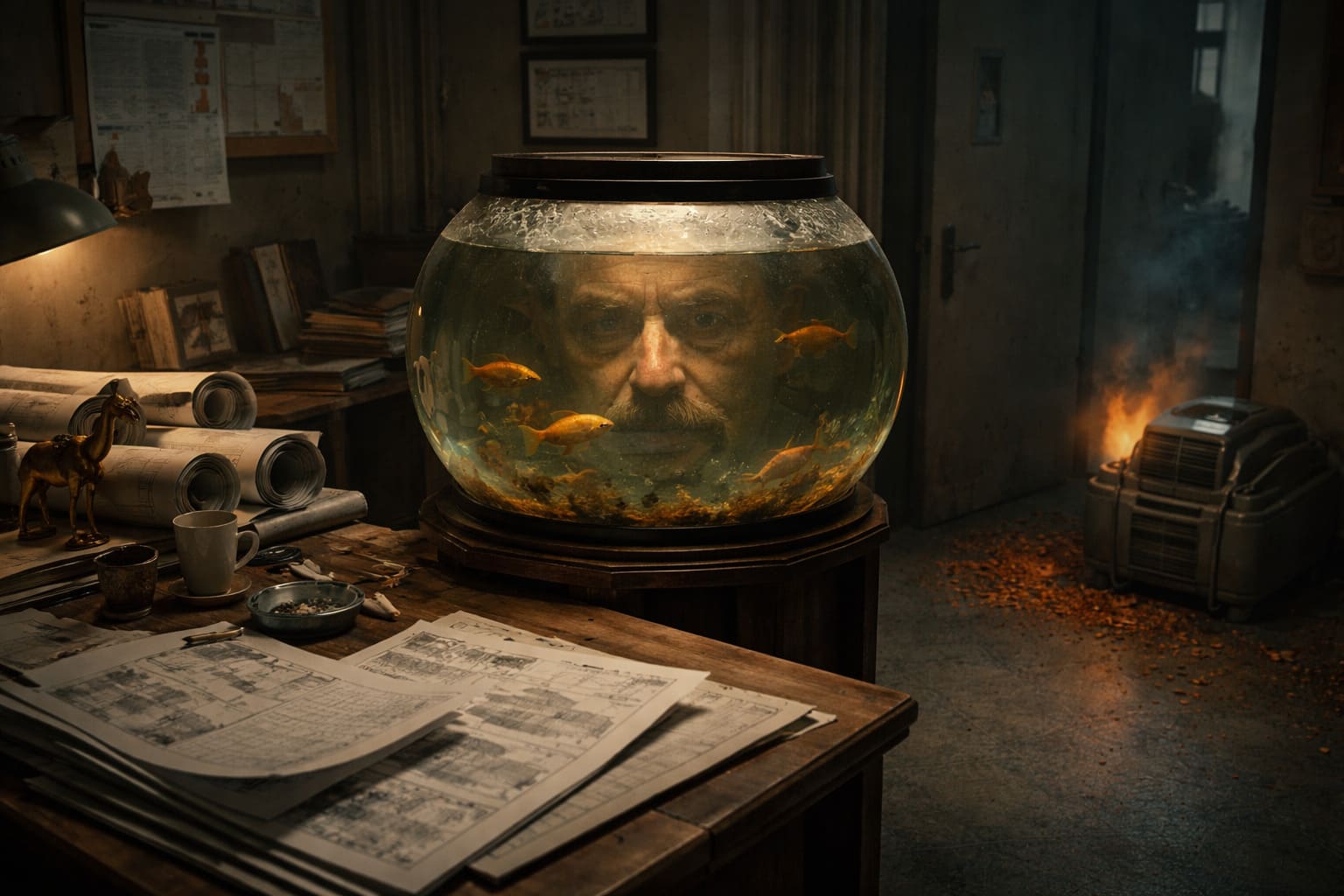 тумбы с аквариумом, он пристально наблюдал за золотыми