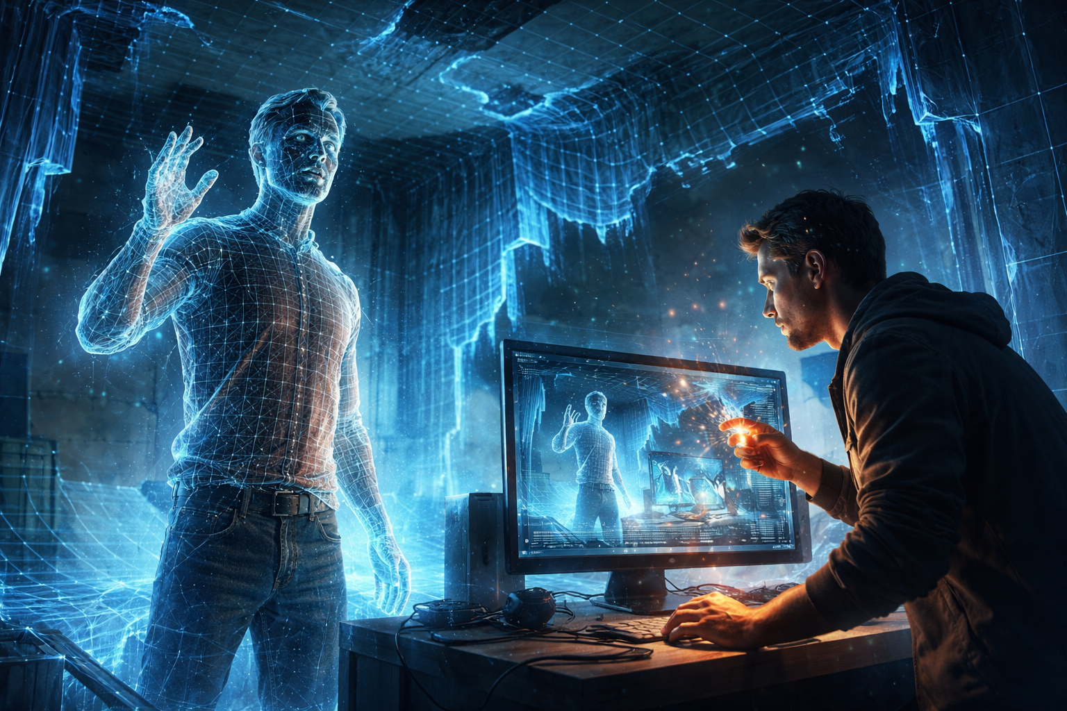 Дверь не открылась — она перезагрузилась. На месте привычного деревянного полотна возникла мерцающая пиксельная дымка, из которой вышел человек в строгом сером костюме. Его фигура то и дело подгружалась: то становилась фотореалистичной, то рассыпалась на грубые полигоны.